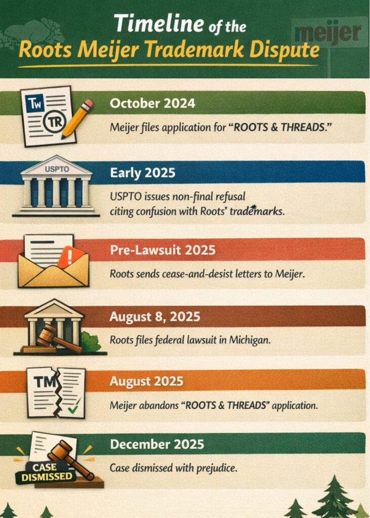 The roots meijer trademark dispute ended in December 2025 when the case was dismissed with prejudice. This means the lawsuit was permanently closed, and Meijer also abandoned its “ROOTS & THREADS” trademark application, effectively ending the legal conflict between the two companies.